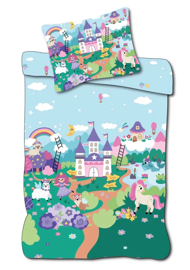 Álmodj tündérmesét ezzel a gyönyörű, színes tündéres és unikornisos gyermek ágyneműhuzattal! A vidám kastélyos, szivárványos minták mosolyt csalnak minden kisgyermek arcára, miközben a puha, bőrbarát pamut kellemes, pihentető alvást biztosít.